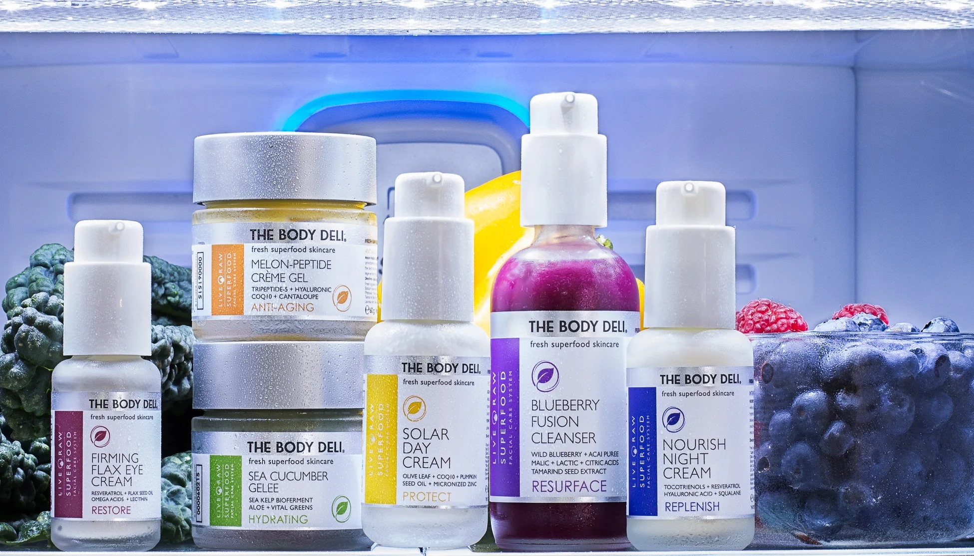 The Body Deli’s superfood skincare system is a breakthrough in skin rejuvenation technology. Clinically tested actives are combined with fresh organic, living botanical superfoods that synergistically provided unparalleled cellular regenerative results.